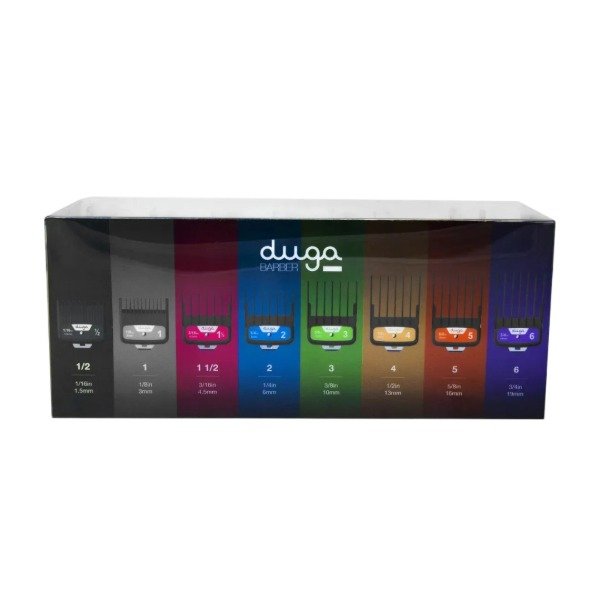 El set DUGA D420 ofrece peines metálicos de alta resistencia, diseñados para un deslizamiento suave y un desempeño profesional. Su construcción fuerte y flexible permite trabajar con precisión en todo tipo de cabello, evitando tirones y asegurando cortes más limpios. Cada peine cuenta con placa metálica reforzada para mayor firmeza y durabilidad. Compatibles con las máquinas Duga Cordless: D405, D408, D412, D413 y D414. Incluye 8 medidas: 1/2 – 1 – 1½ – 2 – 3 – 4 – 5 – 6 Características: - Peines fuertes, flexibles y de larga vida útil - Dientes lisos para un deslizamiento más suave - Placa metálica de alta resistencia - Identificación por colores para un uso más rápido