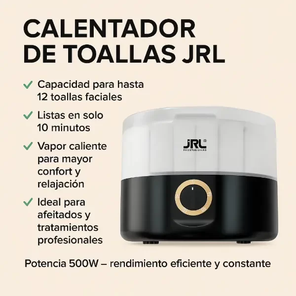 Jrl Calentador De Toallas Peluqueria Barberia Dp003 El Calentador de Toallas a Vapor JRL es el complemento ideal para barberías y salones que buscan brindar una experiencia superior a sus clientes. Diseñado para uso profesional, permite mantener toallas calientes y listas en pocos minutos, elevando la calidad del servicio en afeitados y tratamientos faciales. Su sistema de vapor caliente proporciona una sensación de confort y relajación, ayudando a abrir los poros, suavizar la piel y mejorar notablemente la experiencia del cliente. Gracias a su capacidad para hasta 12 toallas faciales, es perfecto para jornadas de trabajo intensas sin demoras. No requiere remojo previo de las toallas, optimizando tiempos y facilitando el uso diario. Su potencia de 500W garantiza un calentamiento eficiente y una temperatura constante durante todo el servicio. Una herramienta indispensable para quienes buscan profesionalismo, confort y un servicio de alto nivel en cada atención. Características principales: - Capacidad para hasta 12 toallas faciales - Tiempo de calentamiento aproximado: 10 minutos - Sistema de vapor caliente - Ideal para afeitados y tratamientos profesionales - Potencia: 500W