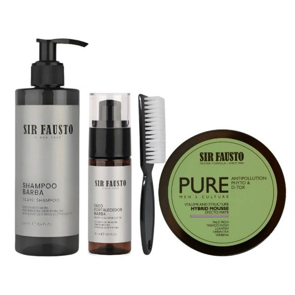 Sir Fausto Kit Barba Shampoo + Oleo fortalecedor + Cepillo + hybrid mousse efecto mate 100 ml