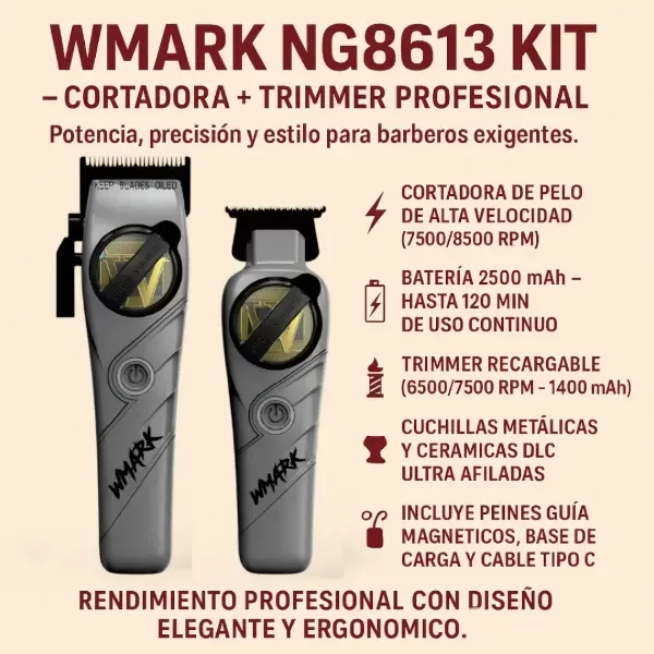 Wmark Clipper + Trimmer ng8613 Kit Base de Carga Barberia