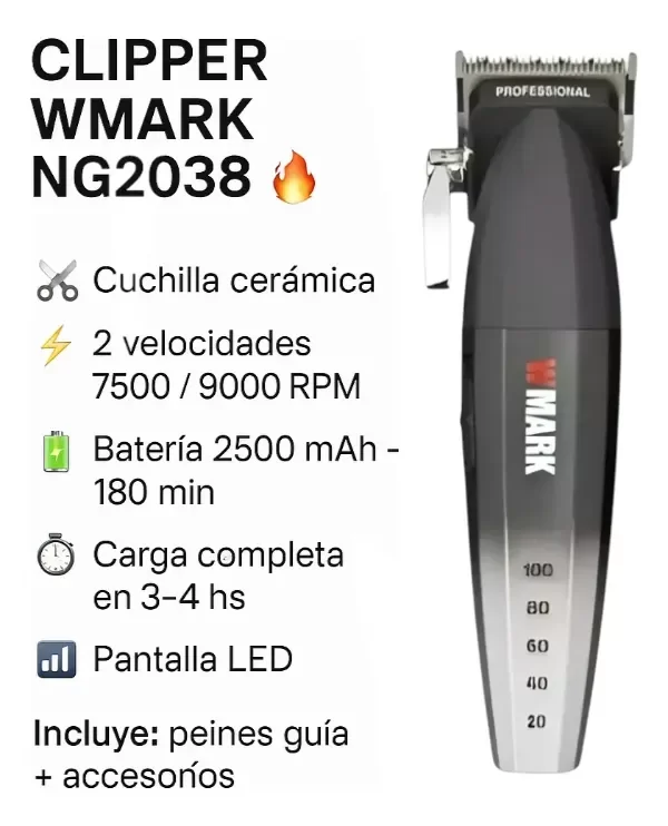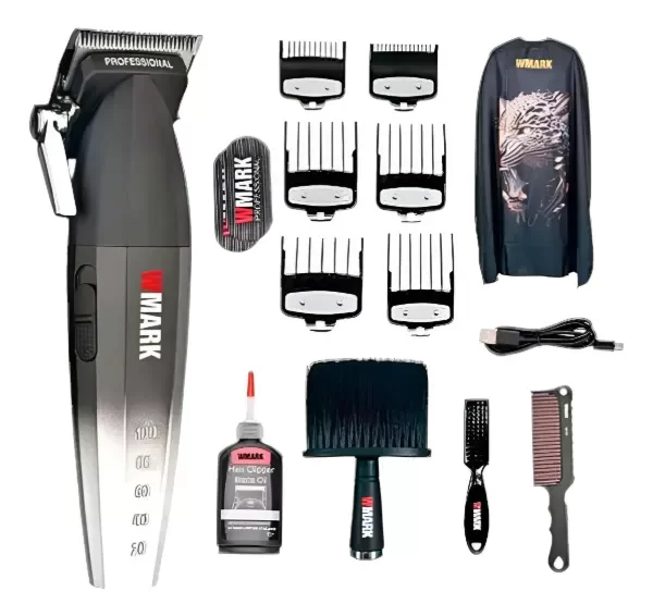 - Accesorios: 6 peines guía (1,5, 3, 4,5, 6, 9, 12mm), cepillo de limpieza, cepillo de pelo, peine de pelo, capa de corte, pegatinas para el pelo y cable USB.