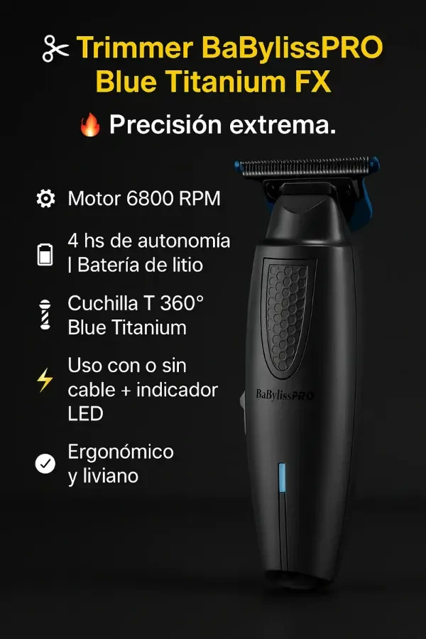 - Cuchilla en “T” 360°: expuesta y recubierta en Blue Titanium, perfecta para líneas definidas y trabajos detallados.