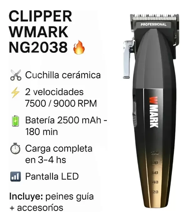 - Accesorios: 6 peines guía (1,5, 3, 4,5, 6, 9, 12mm), cepillo de limpieza, cepillo de pelo, peine de pelo, capa de corte, pegatinas para el pelo y cable USB.